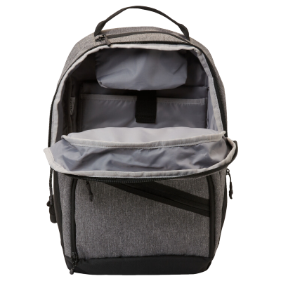 Mochila 1 gran compartimiento principal con cierre y bolsillo para laptop 1 bolsillo frontal cooler con cierre Bolsillo superior con cierre, 2 bolsillos laterales con mesh Correas ergonómicas para hombro Dimensiones: 46 x 32 x 22 cm Volumen: 30L TELA: 100% Poliéster reciclado Producto Importado
